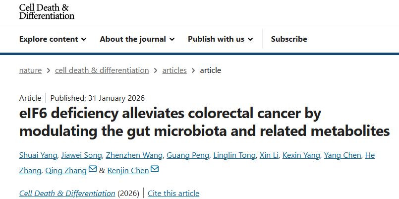 近日,我校生命科學(xué)學(xué)院陳仁金副教授團(tuán)隊在Cell Death & Differentiation(中科院1區(qū)top,IF=15.4)雜志發(fā)表題為eIF6 deficiency alleviates colorectal cancer by modulating the gut microbiota and related metabolites的研究論文。徐州醫(yī)科大學(xué)為論文第一單位,陳仁金副教授和張青教授為通訊作者,研究生楊帥、宋家偉、彭廣及青年教師王珍珍為共同第一作者。該研究工作得到江蘇省高校自然科學(xué)基金重大項目、國家自然科學(xué)基金青年基金及徐州醫(yī)科大學(xué)科技園等基金項目資助。