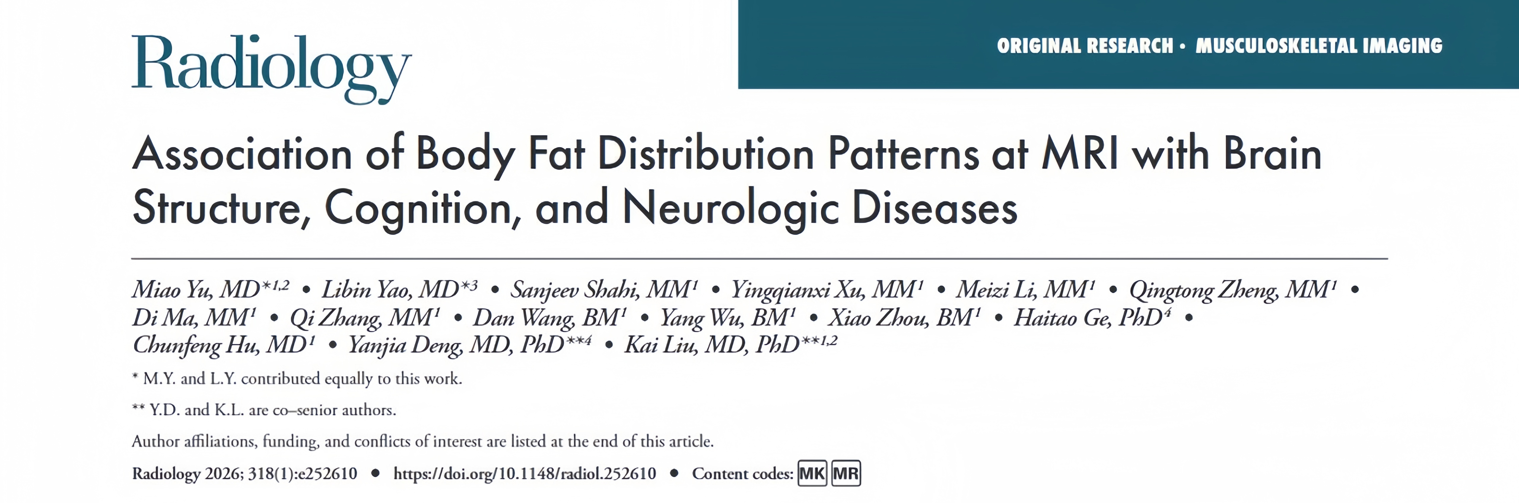該成果于2026年1月27日正式發(fā)表于放射、核醫(yī)學(xué)和醫(yī)學(xué)成像領(lǐng)域排名第一期刊《Radiology》(影響因子15.2,中科院一區(qū)Top),首次以獨立產(chǎn)權(quán)在該雜志發(fā)表原創(chuàng)研究,標(biāo)志著附院在該領(lǐng)域的探索已達(dá)國際先進(jìn)水平,也是上述科室助力高水平研究型醫(yī)院建設(shè)取得的里程碑式新突破。