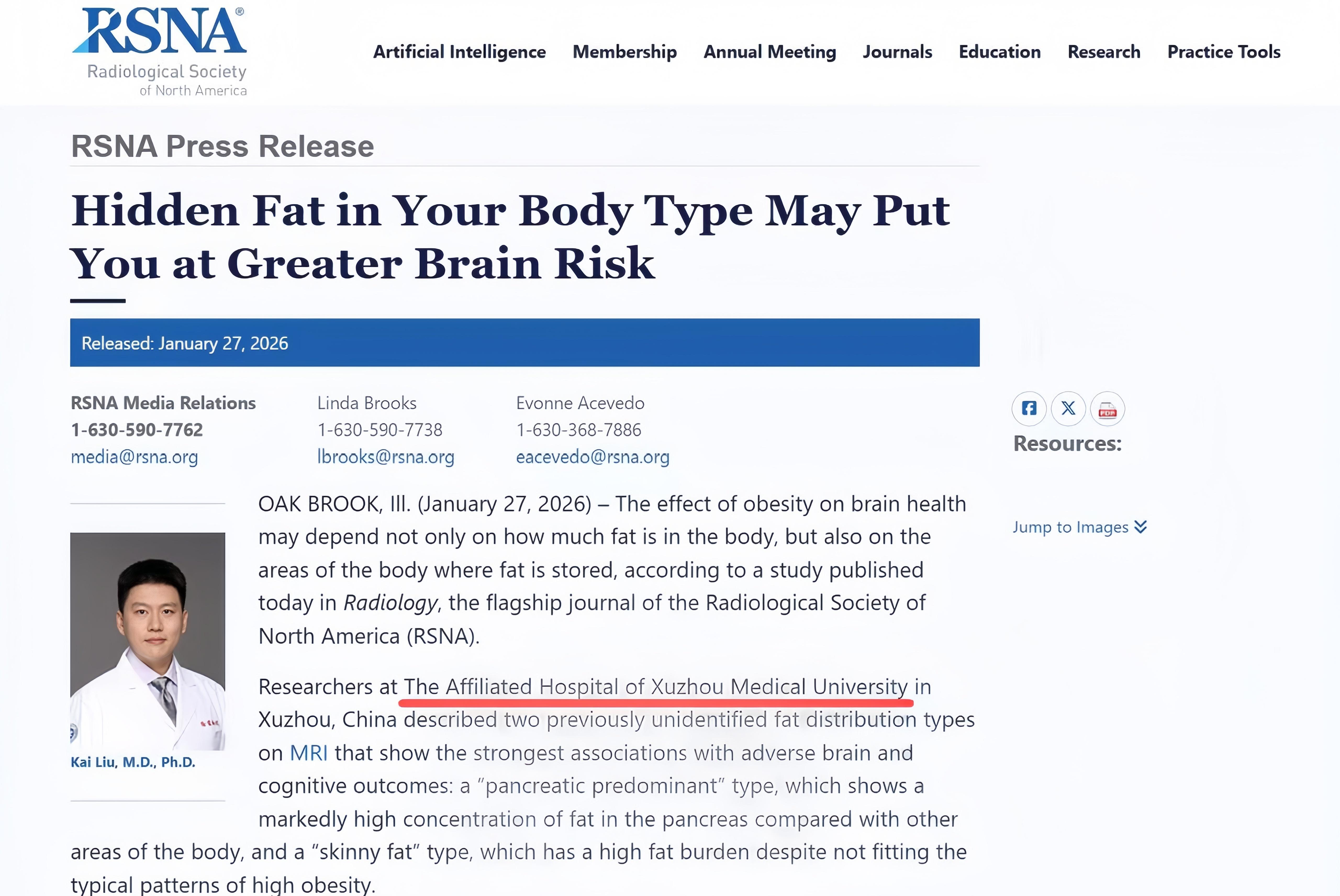 該成果受到國際同行高度關(guān)注,被全球放射學(xué)領(lǐng)域最具影響力的學(xué)術(shù)組織-北美放射學(xué)協(xié)會(RSNA)選為新聞報道。徐醫(yī)附院劉愷教授應(yīng)邀接受協(xié)會采訪,并于美國時間1月27日被MSN、Medical Xpress、ScienceDaily等多家國際知名媒體同步報道(https://www.rsna.org/media/press/2026/2639),這是徐醫(yī)附院成為國內(nèi)目前極少數(shù)獲RSNA專訪的機(jī)構(gòu)之一。
